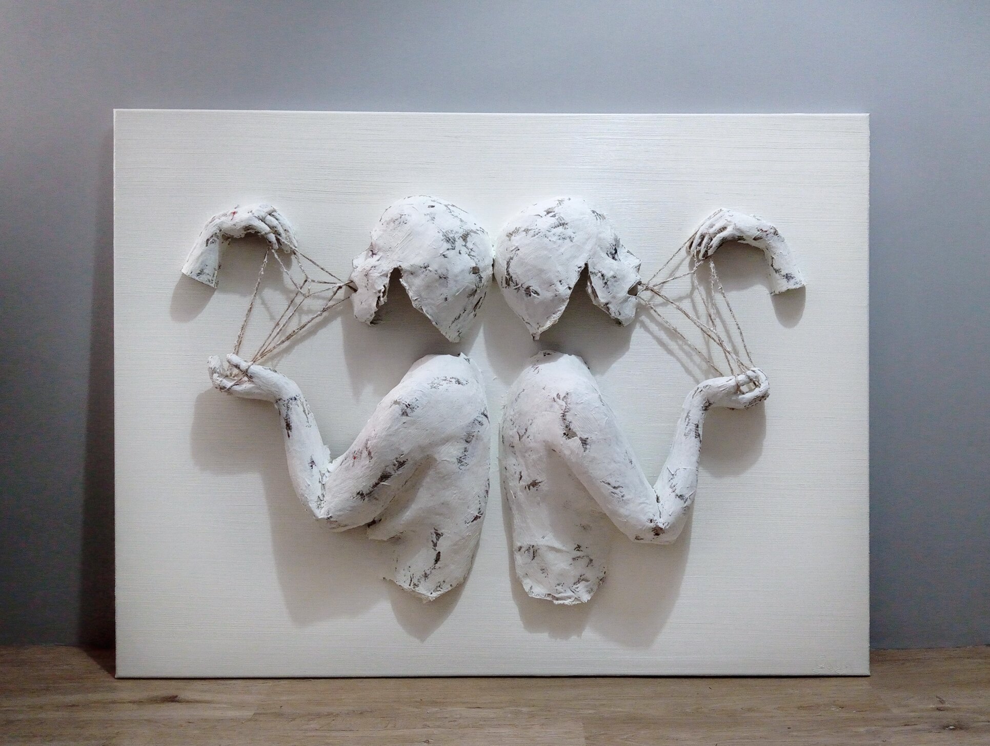 GAYA LASTOVJAK 'Zmowa’ 2020, 90x120x14cm, technika własna, papier mache, sznur, płótno, farba olejna