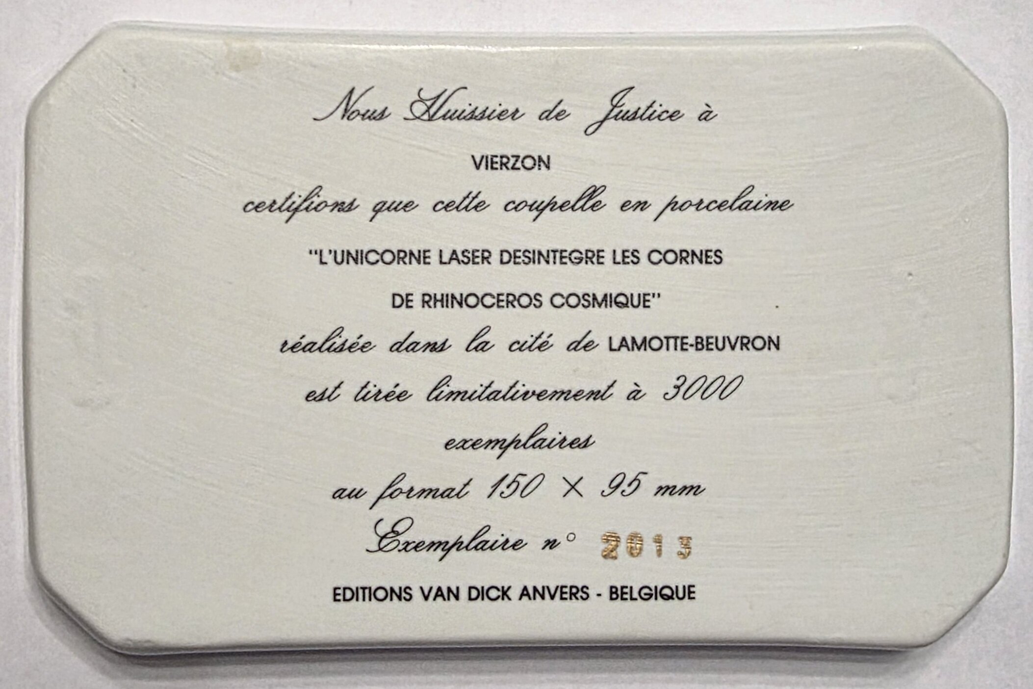 Płytka ceramiczna limitowanej edycji dzieła Salvadora Dalí zatytułowanego „L’Unicorne laser désintègre les cornes de rhinocéros cosmique” (Laserowy jednorożec dezintegruje rogi kosmicznego nosorożca). Sygnatura z przodu, na odwrociu certyfikat wydawcy.